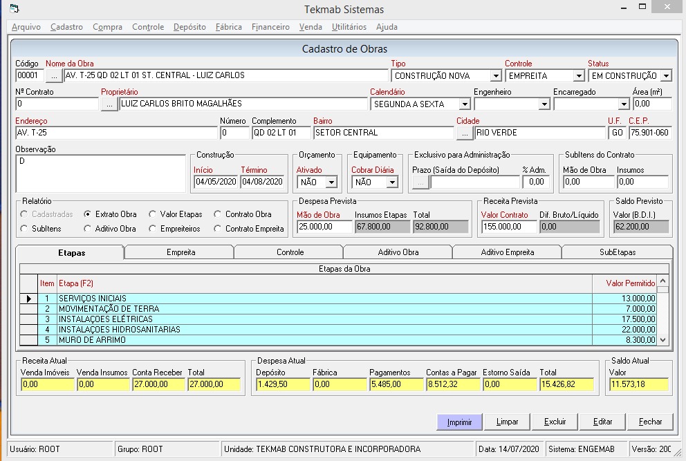 Contempla diversos recursos, como controle de orçamento, receitas e despesas das obras, ordens de compra e cotações, etc.
